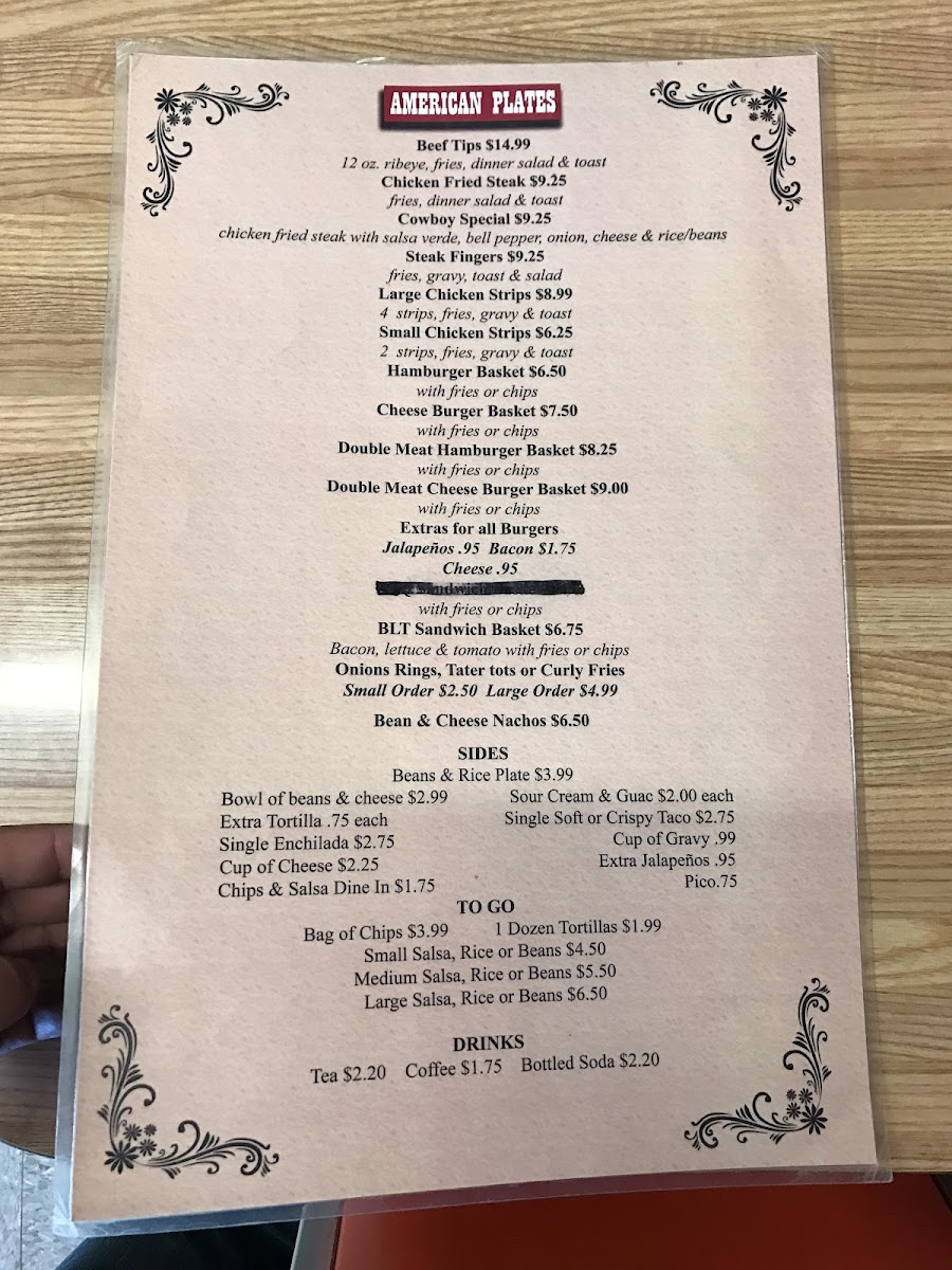 Overall, Rico’s Cafe offers a simple, comforting menu that leans into hearty, no-frills favorites. The American plates like Beef Tips, Chicken Fried Steak, Cowboy Special Steak Fingers, and Large Chicken Strips highlight classic, satisfying options that feel homemade and filling. The sides, including the Beans & Rice Plate, Bowl Of Beans & Cheese, Extra Tortilla, Single Enchilada, and Cup Of Cheese, round out the meal with traditional, flavorful accompaniments. For those grabbing food on the go, choices such as 1 Dozen Tortillas, Small Salsa, Medium Salsa, Large Salsa, Rice Or Beans, and a Bag Of Chips make it easy to take a taste of the cafe home. Lighter bites like the Blt Sandwich Basket and Bean & Cheese Nachos add variety, while simple drink options like Tea, Coffee, and Bottled Soda keep things straightforward. Altogether, the menu feels approachable and comforting, focusing on well-loved dishes rather than an extensive or complex selection.